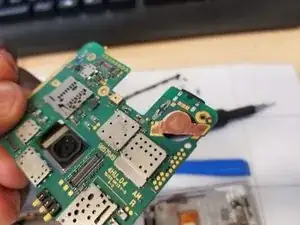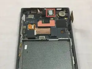 Затем используйте пластиковый инструмент, чтобы приподнять фронтальную камеру, и полностью извлеките её пинцетом.