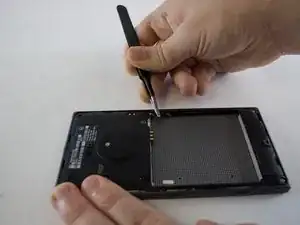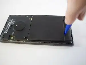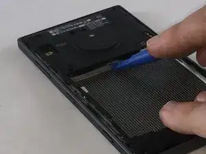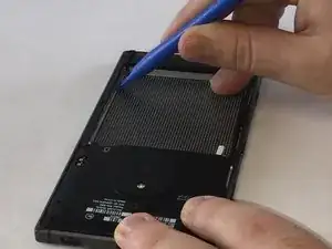 Используйте пластиковый инструмент для вскрытия, чтобы надавить в пазы, удерживающие заднюю панель.