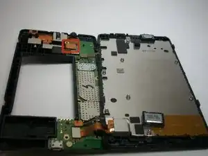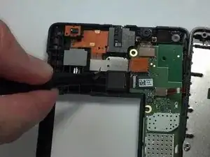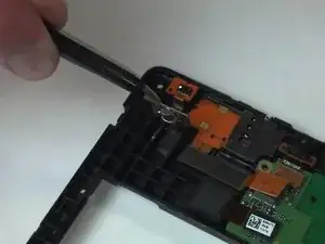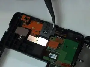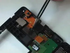 Пинцетом аккуратно отключите коннектор материнской платы, отвечающий за сборку вибромотора, разъёма для наушников и вспышки камеры.