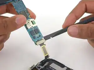 Используйте плоский конец лопатки, чтобы отсоединить разъём шлейфа дочерней платы от его гнезда на обратной стороне материнской платы.