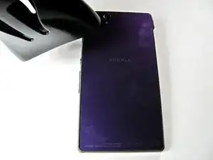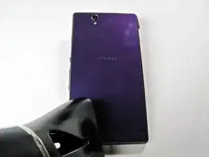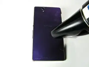 Медленно проводите феном по швам на задней панели телефона. Держите фен в нескольких сантиметрах от корпуса.