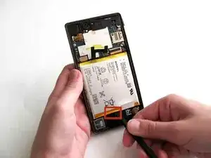 Вставьте лопатку в нижнюю центральную часть, чтобы дополнительно ослабить клей. Аккуратно отделяйте батарею от телефона, проводя лопаткой вертикально под батареей и подцепляя её вверх. Это может занять некоторое время и усилия, поскольку клей очень прочный.