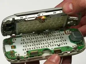 После удаления 6 винтов и обоих упоров телефон будет легко разделить на две основные части.