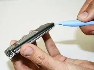 Используя инструмент для открытия iPod, приоткройте корпус, в котором находятся ЖК-дисплеи, вставив его внизу, как показано.