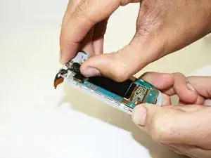 Аккуратно разъедините телефон, и гибкий провод должен отсоединиться от своего соединения, как показано.