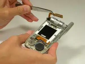 С помощью пинцета отсоедините динамик и вторичную батарею от передней панели, оставив провода подключенными.