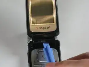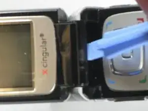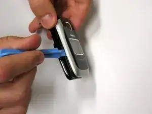 Держите телефон закрытым и вставьте инструмент для iPod между серебристой и чёрной частями корпуса. Проведите инструментом по периметру корпуса, чтобы освободить защёлки.