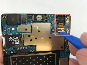 Аккуратно приподнимите ленточный кабель камеры, пока весь модуль передней камеры не будет извлечён.