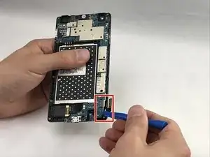 Используя пластиковый инструмент, приподнимите разъём дисплея, пока он не отсоединится от нижней правой части телефона.
