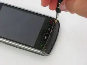 Подденьте инструмент для вскрытия под переднюю пластиковую накладку, расположенную ниже кнопок с красной и зелёной телефонными символикой.