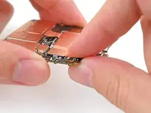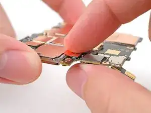 Используйте пинцет или пальцы, чтобы потянуть кронштейн к правому краю телефона и освободить его защёлку.