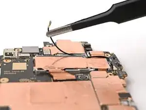 Используйте пинцет, чтобы удерживать разъём кабеля антенны над его гнездом и аккуратно прижмите пальцем или лопаткой, пока разъём не щёлкнет на месте.