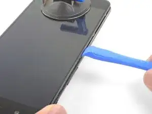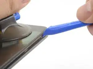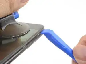 Вставьте край инструмента для вскрытия прямо в стык рамки рядом с присоской, пока край не застрянет между пластиковой рамкой и кромкой задней крышки.