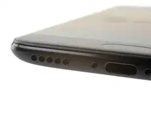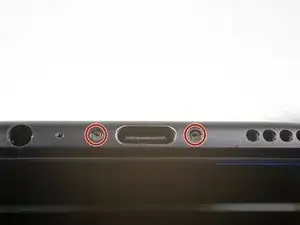Удалите два винта T2 длиной 2,6 мм, симметрично расположенные по обе стороны от разъёма USB-C на нижнем торце телефона.