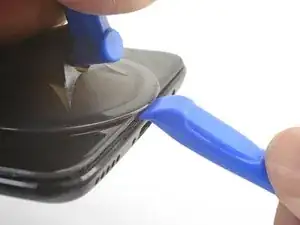 Аккуратно направляйте инструмент вокруг левого угла телефона, удерживая кромку инструмента внутри стыка.