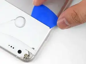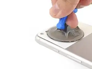 Используйте медиатор или палец, чтобы с силой нажать на линзу с внешней стороны (той стороны, которую обычно видно на телефоне) стеклянной панели, пока она не ослабнет в своём гнезде.