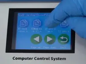 Закройте дверцу. Выберите из списка моделей чертёж задней крышки iPhone 11 Pro Max, затем нажмите кнопку «Figures» — станок автоматически выполнит лазерную обработку заднего стекла.