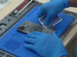 Сначала поместите заднее стекло iPhone 11 Pro Max в центрирующую формовочную матрицу.