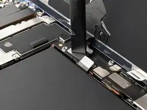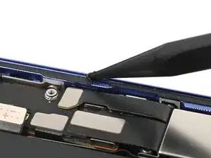 Проведите вторую лопатку вокруг нижнего левого угла и вдоль левого края экрана, чтобы отделить клей и освободить металлические защёлки.