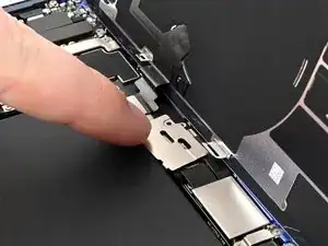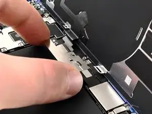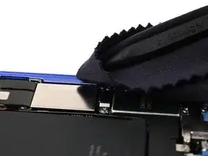 Используйте пинцет с тупыми кончиками или пальцы, чтобы сдвинуть крышку в сторону левого края телефона и освободить её крючок из гнезда на плате.