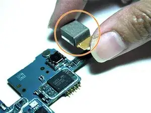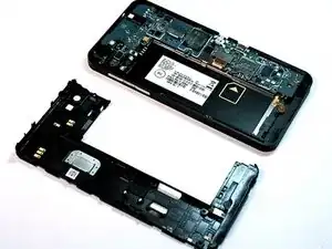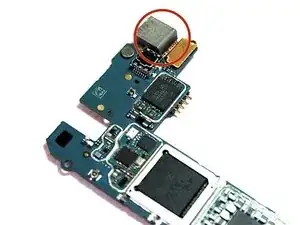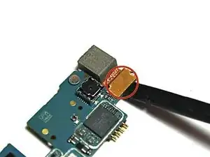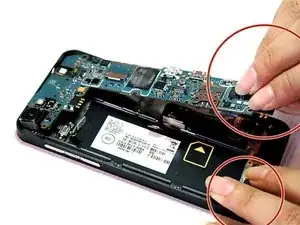Теперь, когда все ленточные кабели отключены, аккуратно поднимите материнскую плату из гнезда большим и указательным пальцами. Начните поднимать плату с нижней части и продвигайтесь к верхней. Другой рукой держите телефон, чтобы лучше удерживать устройство. После извлечения переверните материнскую плату.
