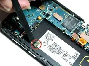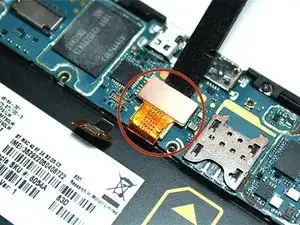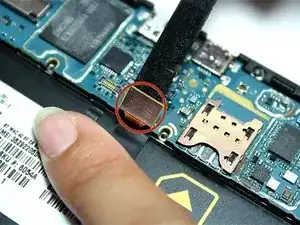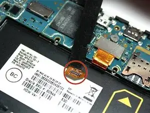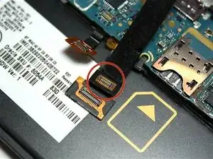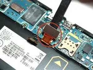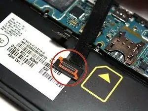 Далее используйте нейлоновую лопатку, чтобы открыть позолоченный ленточный кабель, находящийся рядом с гнездом аккумулятора.