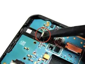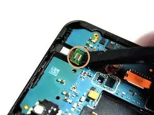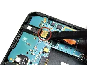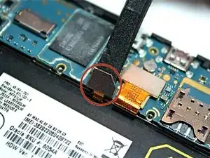 Чтобы отключить заднюю камеру от материнской платы, аккуратно поднимите позолоченный разъём. Он расположен прямо под задней камерой.