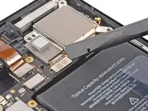 Используйте пинцет с тупыми концами или чистый ноготь, чтобы аккуратно отклеить чёрную графитовую плёнку от левого края аккумулятора и экрана материнской платы.