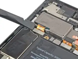 Используйте лопатку, чтобы отсоединить шлейф телефото-камеры, поддев разъём строго вверх от его гнезда.