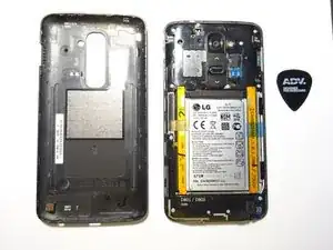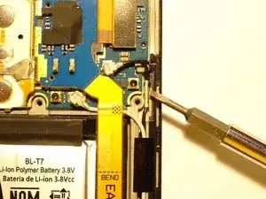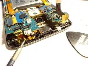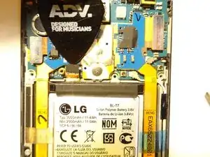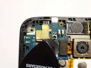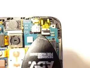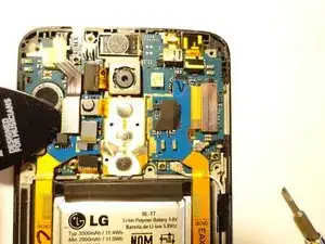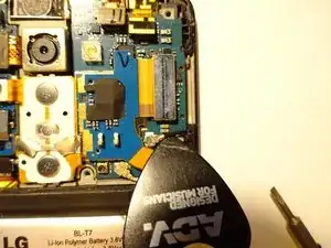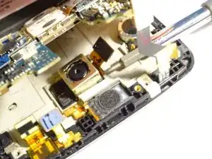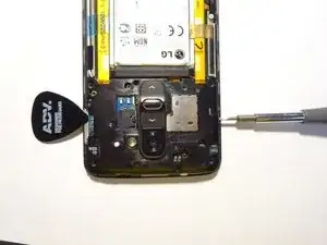Здесь можно использовать плоскую отвёртку, чтобы поддеть, как показано. Не беспокойтесь о повреждении шлейфа камеры, если он уже сломан. (Если вы извлекаете модуль из другого G2, действуйте осторожно: используйте пластиковую лопатку при желании, аккуратно вставьте и приподнимите. Когда модуль немного отойдёт, нарушив ленту под ним, можно вынуть его вручную.)