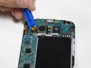 Вставьте пластиковый инструмент для открытия между соединителем камеры и материнской платой, затем поднимите. Он должен легко выскочить.