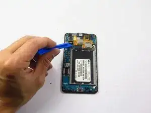 Используйте пластиковый инструмент для открытия, чтобы отсоединить разъем между задней камерой и материнской платой.