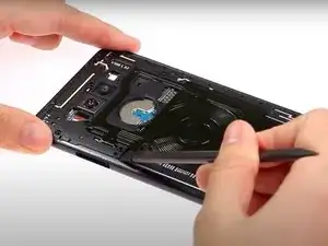 С помощью пластикового инструмента подденьте среднюю рамку телефона.