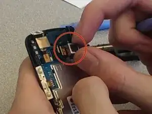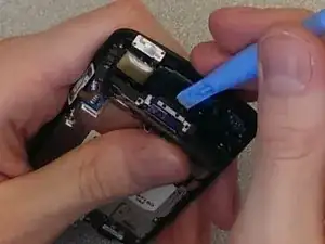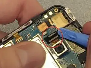 Используя синий пластиковый инструмент, отсоедините черную пластину рядом с камерой.