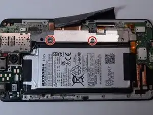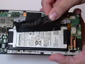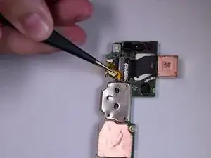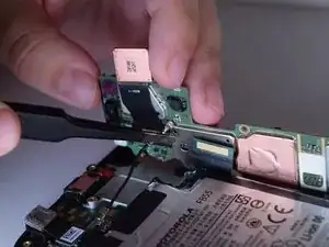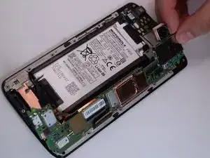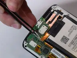 Аккуратно приподнимите плату и с помощью тупых пинцетов отсоедините чёрный антенный кабельный разъём в верхней части батареи.