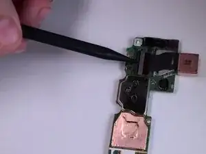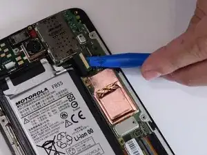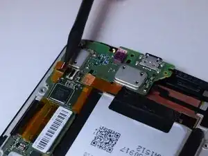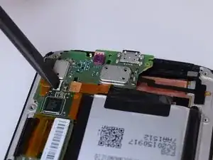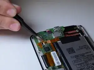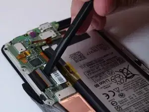 С помощью пластикового инструмента для вскрытия отщёлкните небольшой чёрный шлейф в верхнем правом углу батареи.