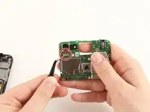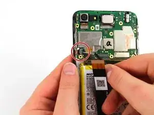 С помощью изогнутых пинцетов отсоедините два разъёма от материнской платы, потянув металлическую головку вверх и от телефона.