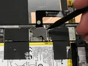 Аккуратно снимите металлическую пластину, закрывающую основание шлейфа дисплея.