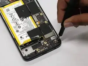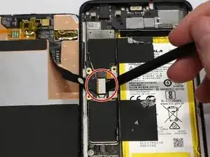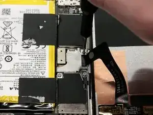 Под этой металлической деталью находится основание шлейфа. С помощью лопатки вертикально приподнимите разъём, чтобы отсоединить его от порта.