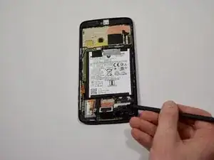 Убедитесь, что ваш инструмент находится позади всего узла экрана, а не только под дисплеем. При правильном выполнении вы должны заметить, что тонкая серебристая металлическая средняя рамка поднимается вместе с пластиковым дисплеем (как на фото).