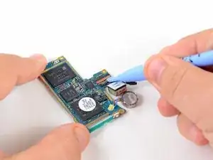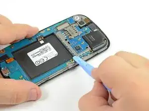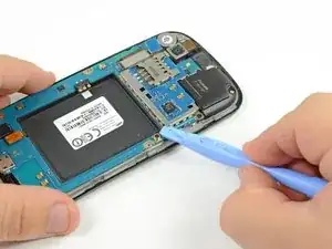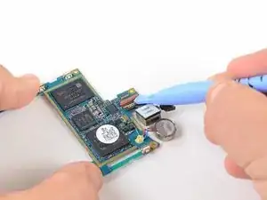 Используя край пластикового инструмента для вскрытия, приподнимите батарею с конца, ближайшего к разъёму для наушников.