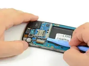 Используйте плоский край пластикового инструмента для вскрытия, чтобы поддеть разъём платы SIM и отсоединить его от гнезда на материнской плате.