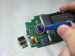 Выверните винт Torx T5 длиной 4,5 мм, отмеченный красным кружком на фото. (Примечание: все винты, которые вы будете выкручивать в телефоне, одинаковые.)