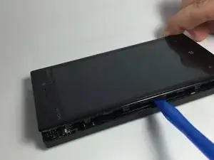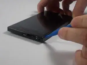 Используя инструменты для открывания из пластика, начните освобождать пластиковые защёлки по периметру телефона. Начните с верхнего левого угла, двигайтесь вниз по левой стороне. Затем обработайте верхнюю и нижнюю части телефона и, наконец, правую сторону.