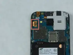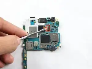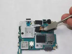 Переверните материнскую плату и отсоедините шлейф, соединяющий камеру с платой, с помощью металлической лопатки iFixit.