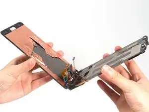 Отрежьте клейкую ленту дисплея, освободите защёлки вокруг посадочного места батареи и вытолкните весь передний модуль из средней рамки.