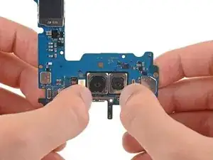 Большими ногтями нажмите на металлические ободки, чтобы отделить заднюю камеру от материнской платы.