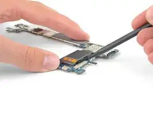С помощью наконечника лопатки отсоедините оранжевый шлейф, соединяющий аккумулятор с платой.