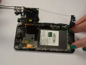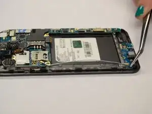 Осторожно отожмите часть материнской платы, показанную на изображении слева, от той части телефона, под которую она защёлкнута.