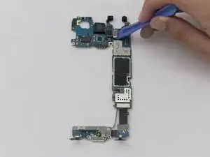 С помощью пластикового инструмента для вскрытия аккуратно отсоедините ленточный кабель, соединяющий заднюю камеру с материнской платой.